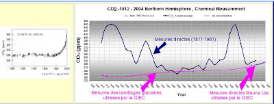 Les mesures rapportées ici sont effectuées à 2m au dessus du sol. La courbe des mesures directes (en bleu foncé) diffère notablement de la courbe de gauche, et de courbes (en mauve) rapportés par le GIEC. Celle publiée par le GIEC ne montre aucun "accident" notable entre 1810 et 1970 avec une valeur moyenne de 300 ppm. Par contre, les mesures directes ci-dessus donnent des valeurs en moyenne nettement plus élevées (environ 340 ppm) et surtout montrent que la proportion de CO2 dans l'atmosphère a beaucoup varié pendant cette période et a plusieurs fois largement dépassé la valeur actuelle de 384ppm, (dont on nous dit qu'elle est catastrophique). Ainsi en 1823 (440ppm), en 1855 (390ppm) et en 1942 (440ppm). A noter que la date de 1942 correspond à un pic de température (avant le refroidissement jusqu'en 1975) que n'a pas vu la crosse de hockey